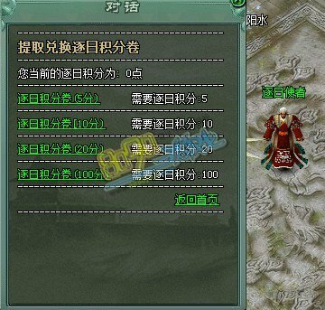 注意,此天神只有1W血,而且攻击力只有真的1/10),打死后会爆出逐日积分。而击杀逐日战神爆出的积分只有5分、10分和20分,100分的逐日积分卷只有在逐日使者兑换才有的,比较方便交易。